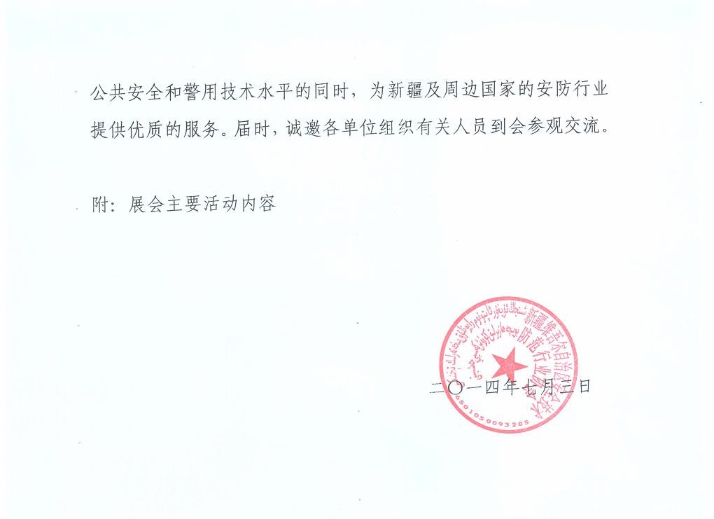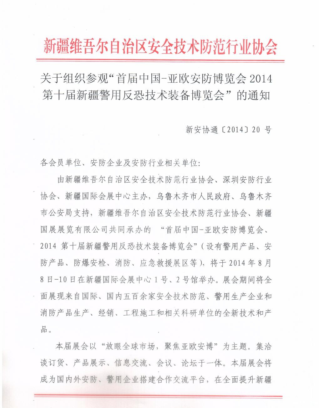 关于组织参观“首届中国——亚欧安防博览会2014第十届新疆警用反恐技术装备博览会”的通知