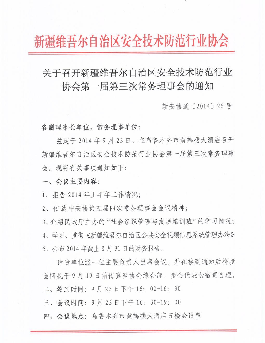 关于召开新疆安防协会第一届第三次常务理事会的通知