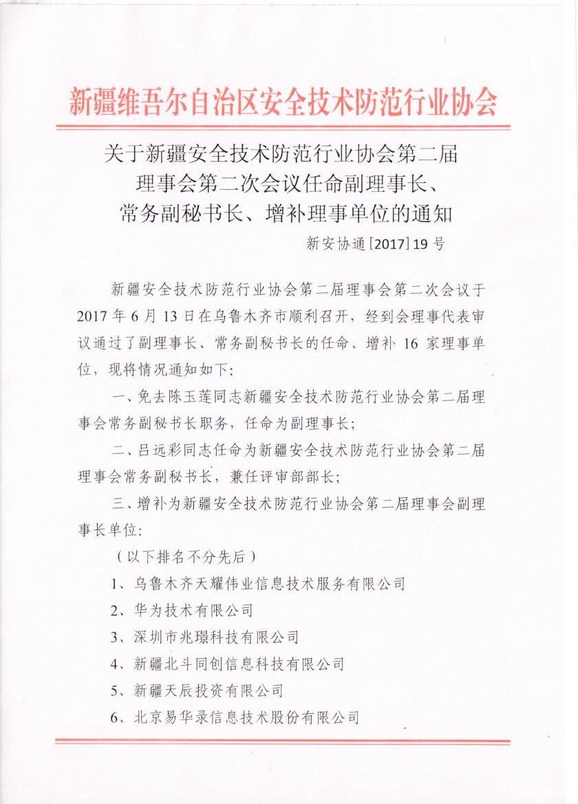 关于新疆安全技术防范行业协会第二届理事会第二次会议任命副理事长、常务副秘书长、增补理事单位的通知