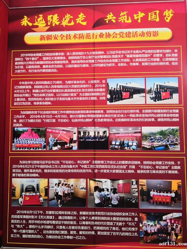 为紧跟大政方针,第六届中国-亚欧安防博览会特设新疆安防行业“不忘初心 牢记使命”党建专题活动区,活动由新疆安全技术防范行业协会和亚欧安防博览会组委会主办,新疆安防协会会员单位参与,牢牢把握守初心、担使命,找差距、抓落实的总要求,以设计新颖、主题鲜明的图文展区形式呈现:党的光辉历程展示区、重温入党誓词区、“爱心奉献,温暖同行”主题区、红色刊物阅读区等。