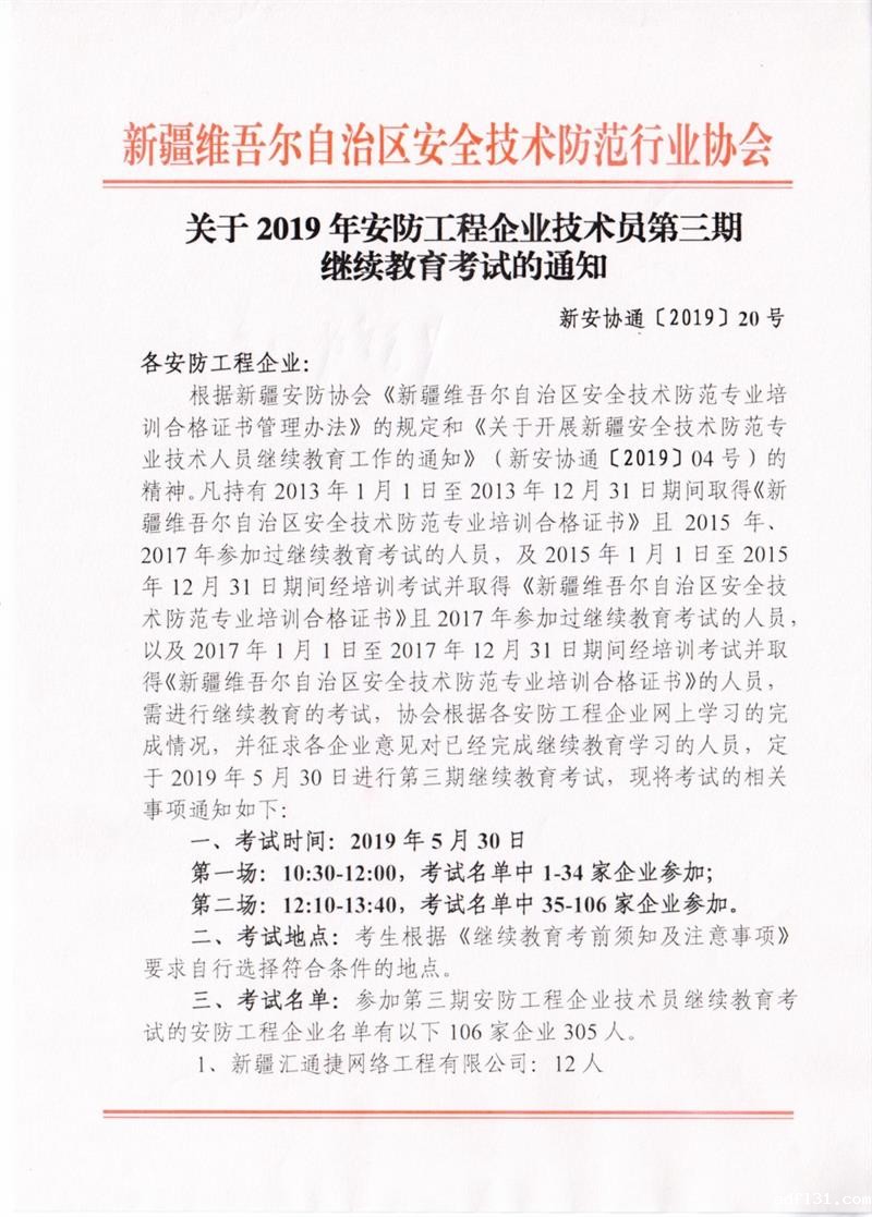 关于2019年安防工程企业技术员第三期继续教育考试的通知