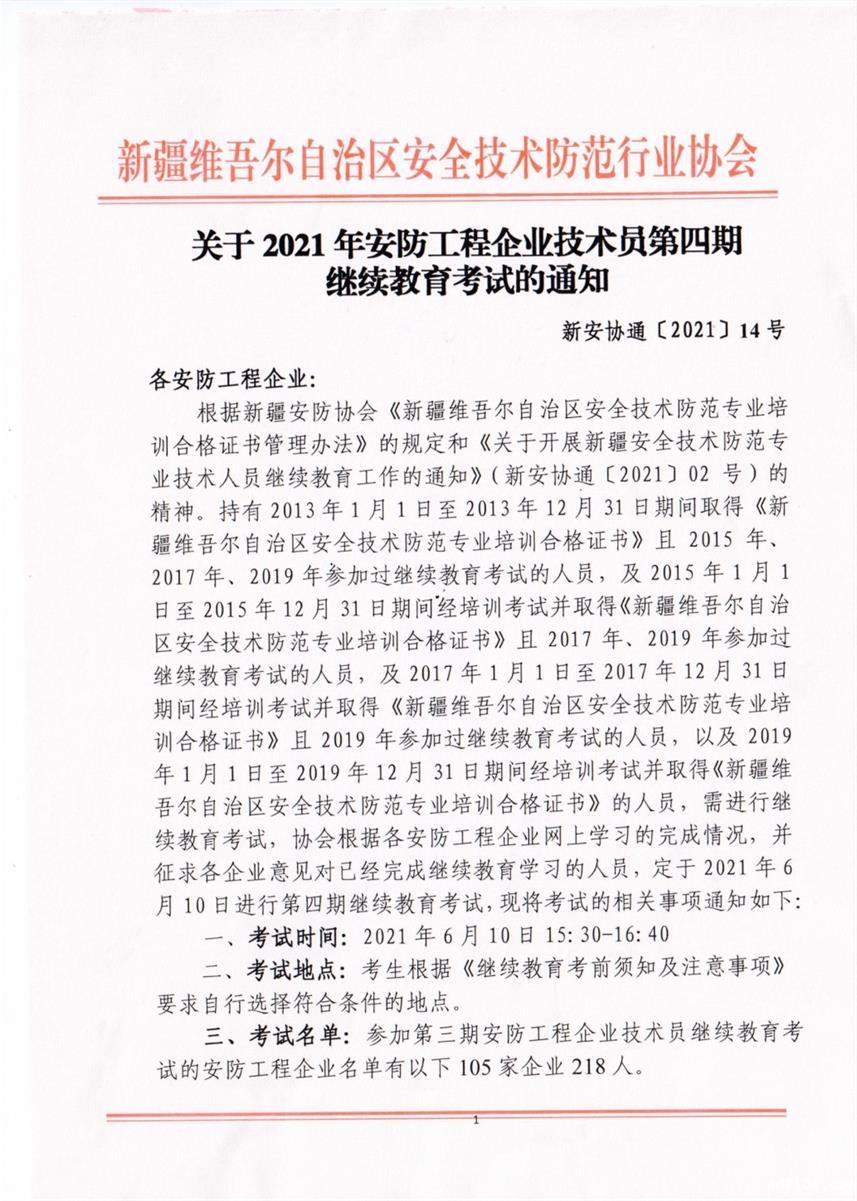 关于2021年安防工程企业技术员第四期继续教育考试的通知