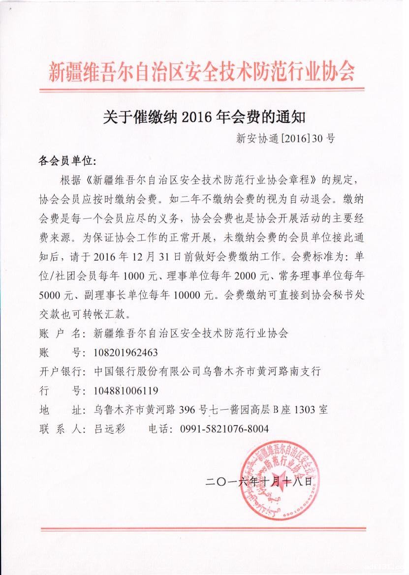 关于催缴纳2016年会费的通知