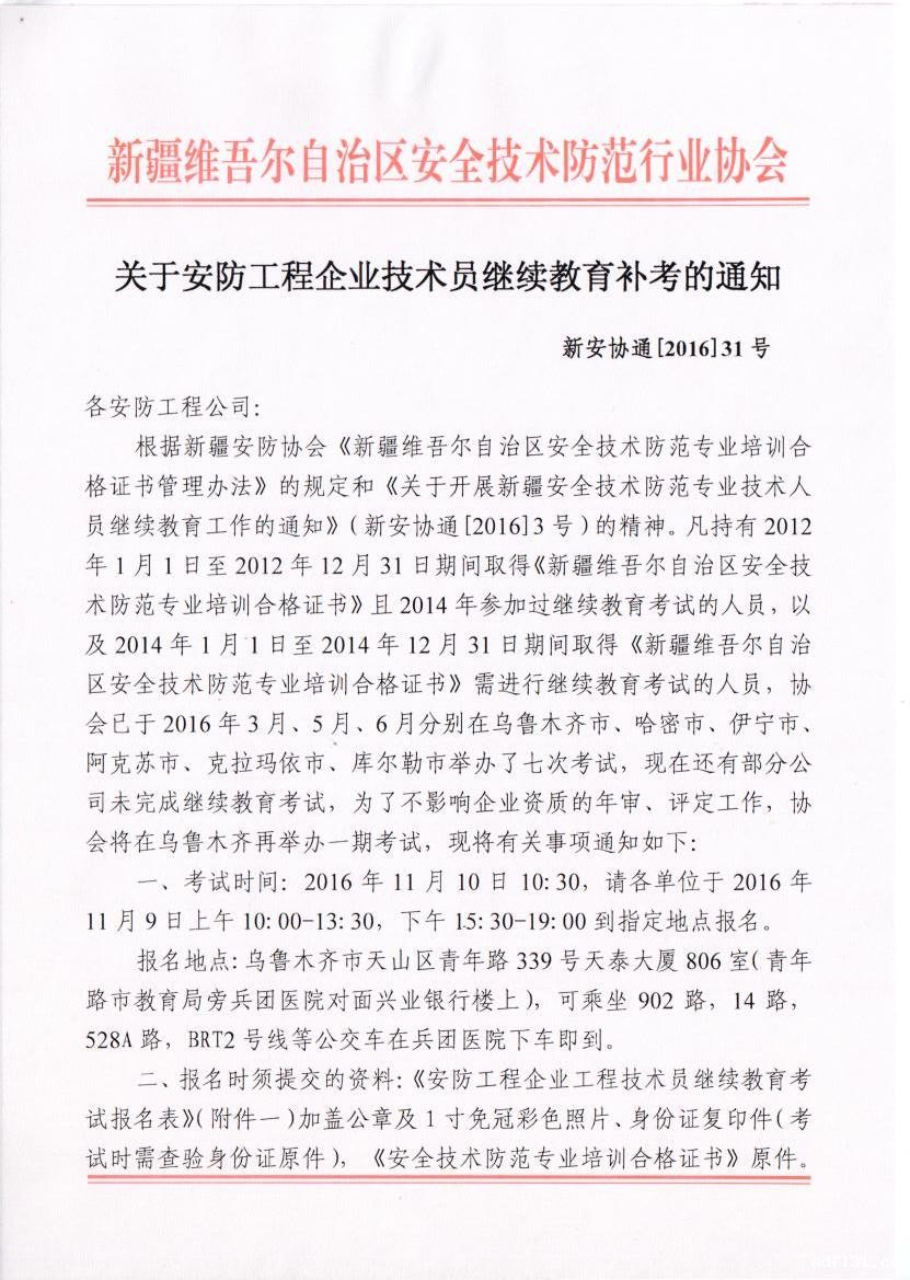 关于安防工程企业技术员继续教育补考的通知