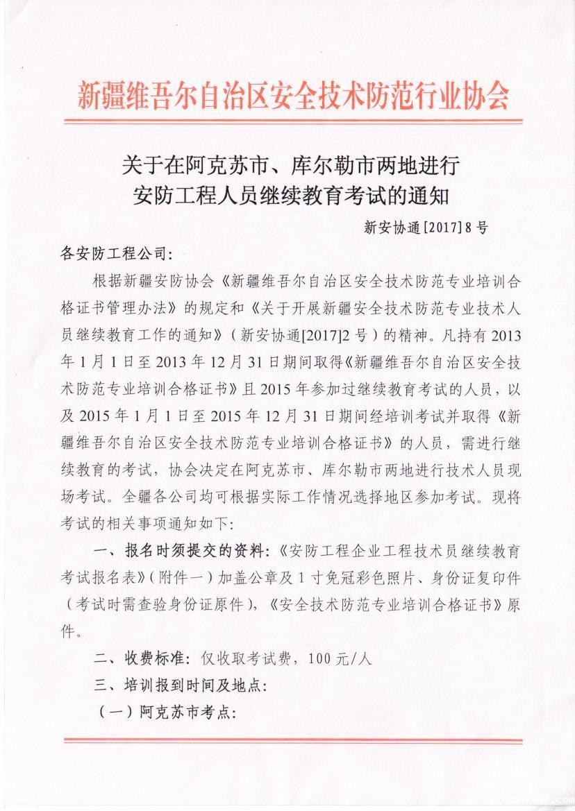 关于在阿克苏市、库尔勒市两地进行安防工程人员继续教育考试的通知