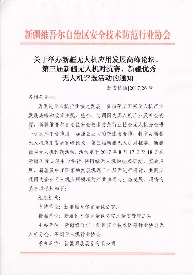 关于举办新疆无人机应用发展高峰论坛、第三届新疆无人机对抗赛、新疆优秀无人机评选活动的通知