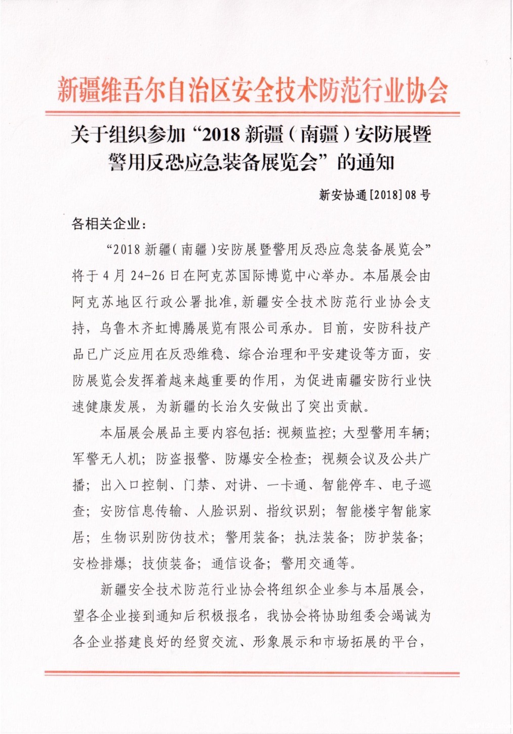 关于组织参加“2018新疆(南疆)安防展暨警用反恐应急装备展览会”的通知