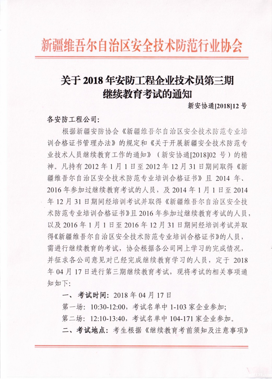 关于2018年安防工程企业技术员第三期继续教育考试的通知