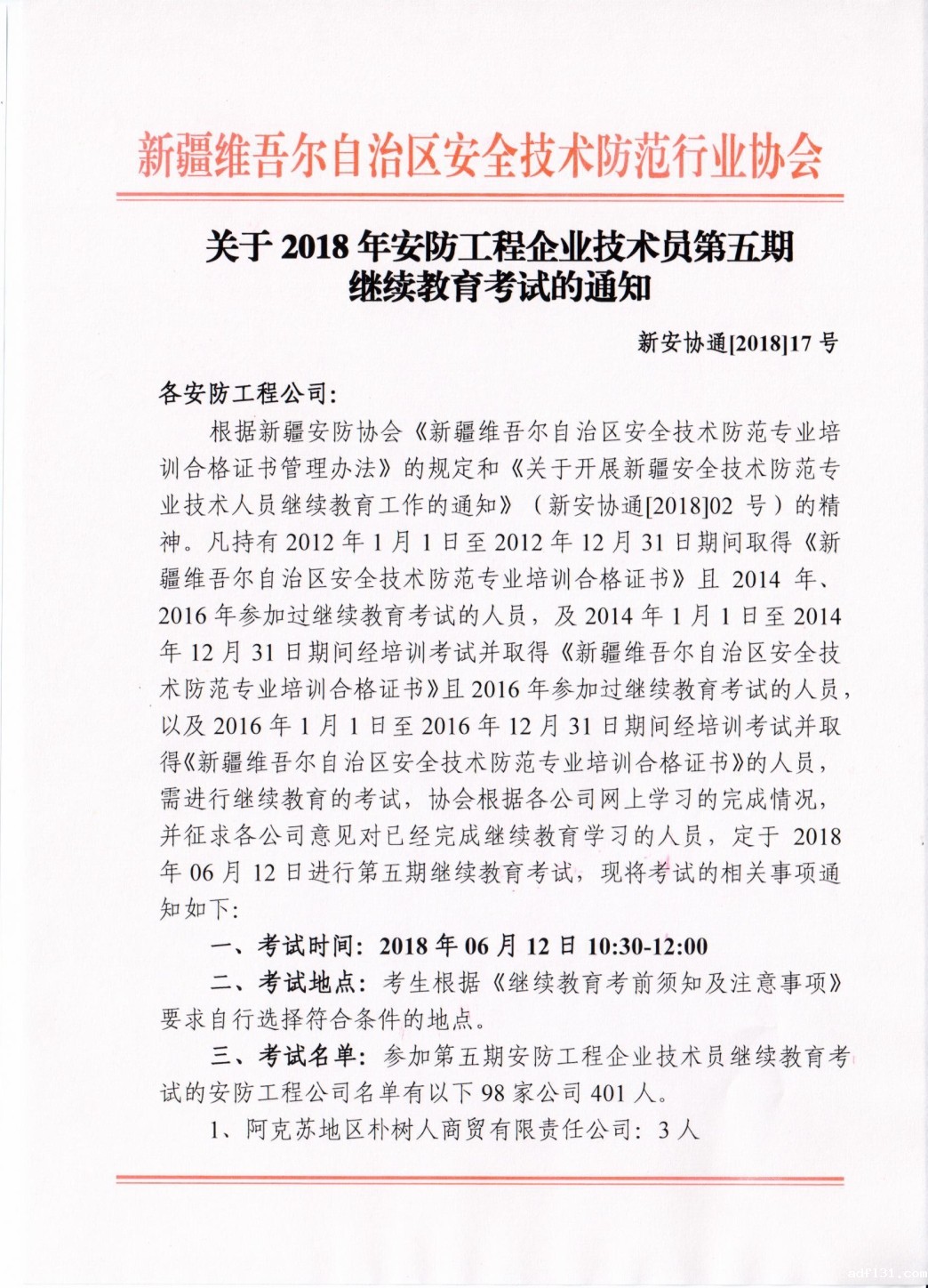 关于2018年安防工程企业技术员第五期继续教育考试的通知