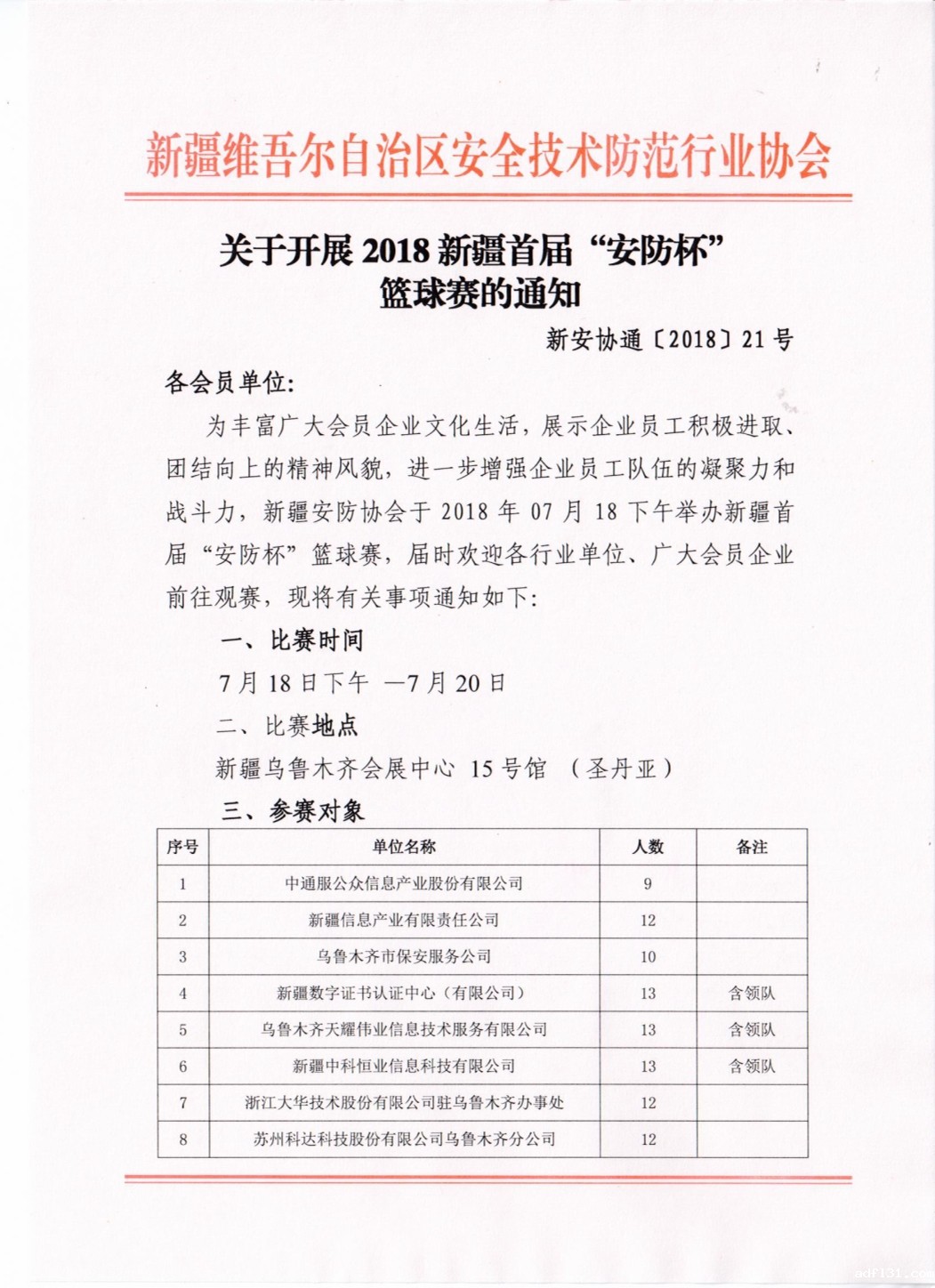 关于开展2018新疆首届“安防杯”篮球赛的通知