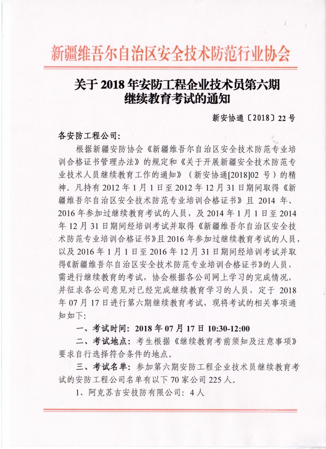 关于2018年安防工程企业技术员第六期继续教育考试的通知