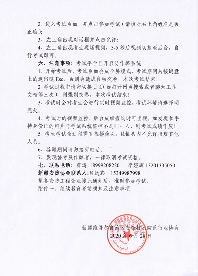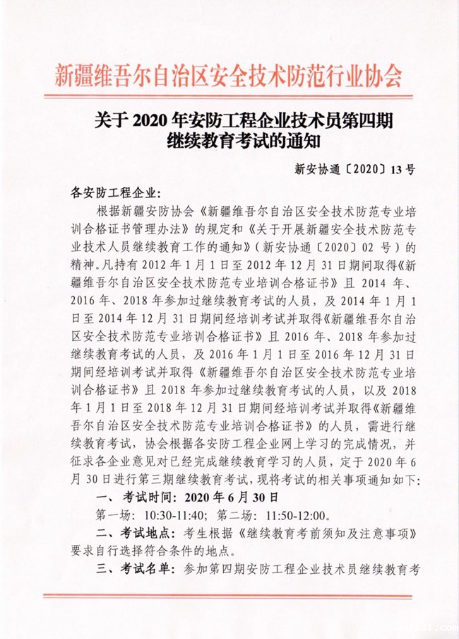 关于2020年安防工程企业技术员第四期继续教育考试的通知