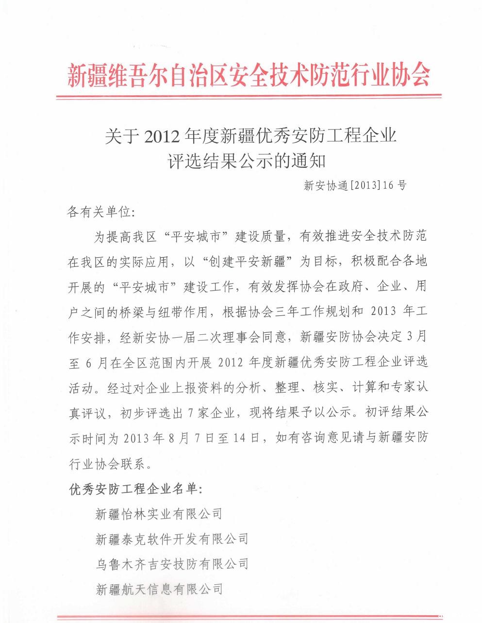 关于2012年度新疆优秀安防工程企业评选结果公示的通知
